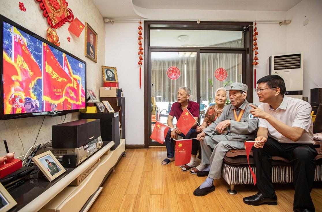 抗戰(zhàn)老兵張立忠在電視機(jī)前觀看閱兵儀式