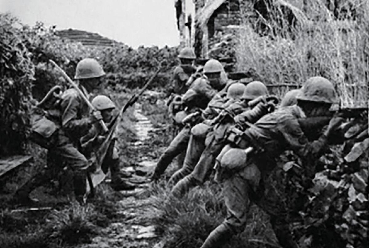 1938年10月2日,富水河岸。侵華日軍藤岡部隊(duì)的機(jī)槍手正在向中國守軍掃射。